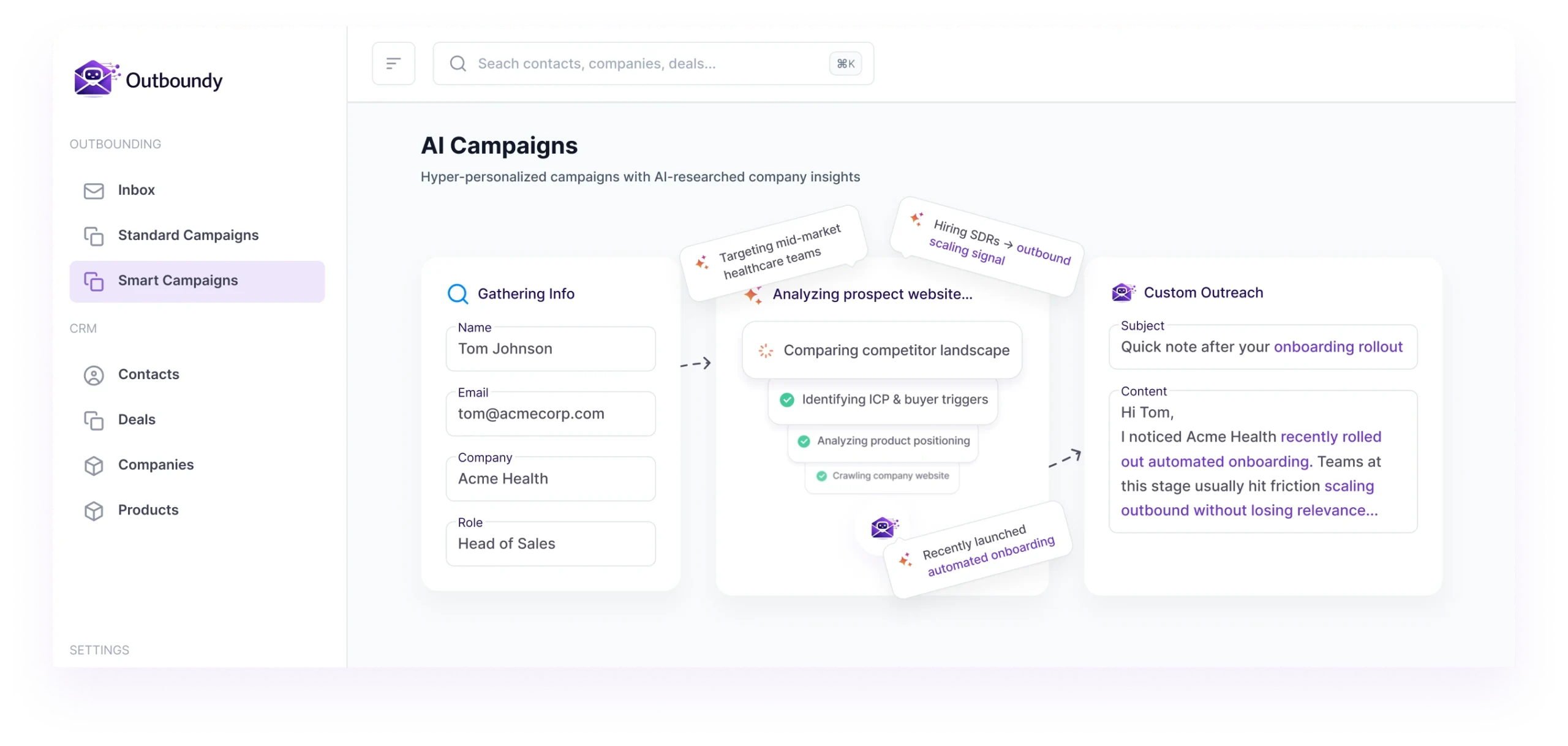 Most teams at that stage burn weeks personalising emails or give up and blast templates. Outboundy's AI already knows what you sell and writes each email around the prospect's specific situation, so your new reps skip the ramp time entirely.