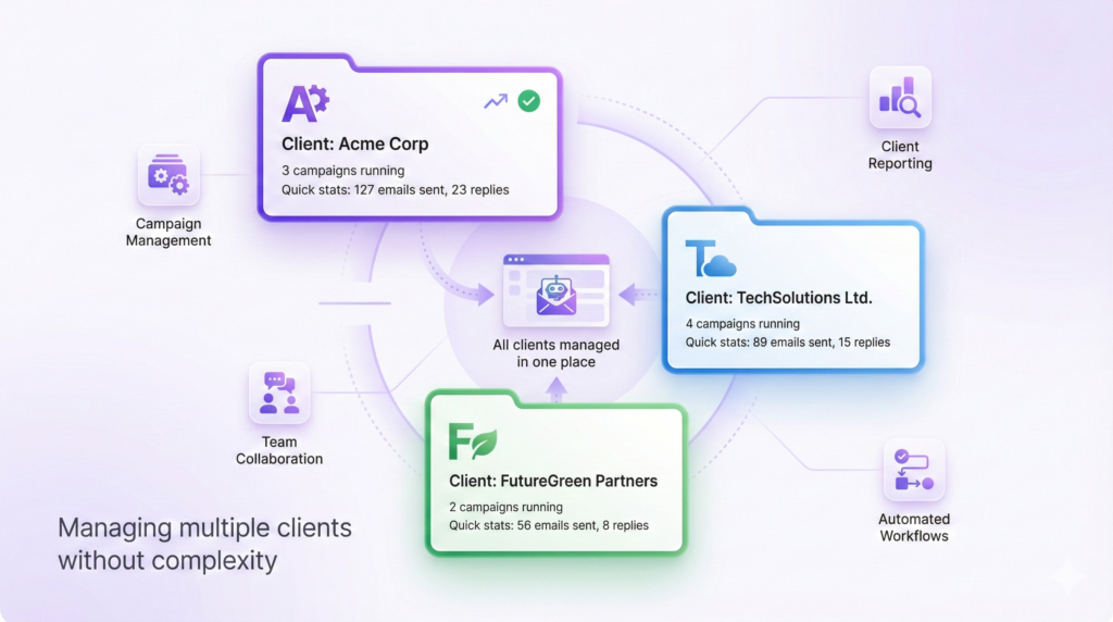 Run outreach for 10 clients or 100. AI writes personalised emails for each, you